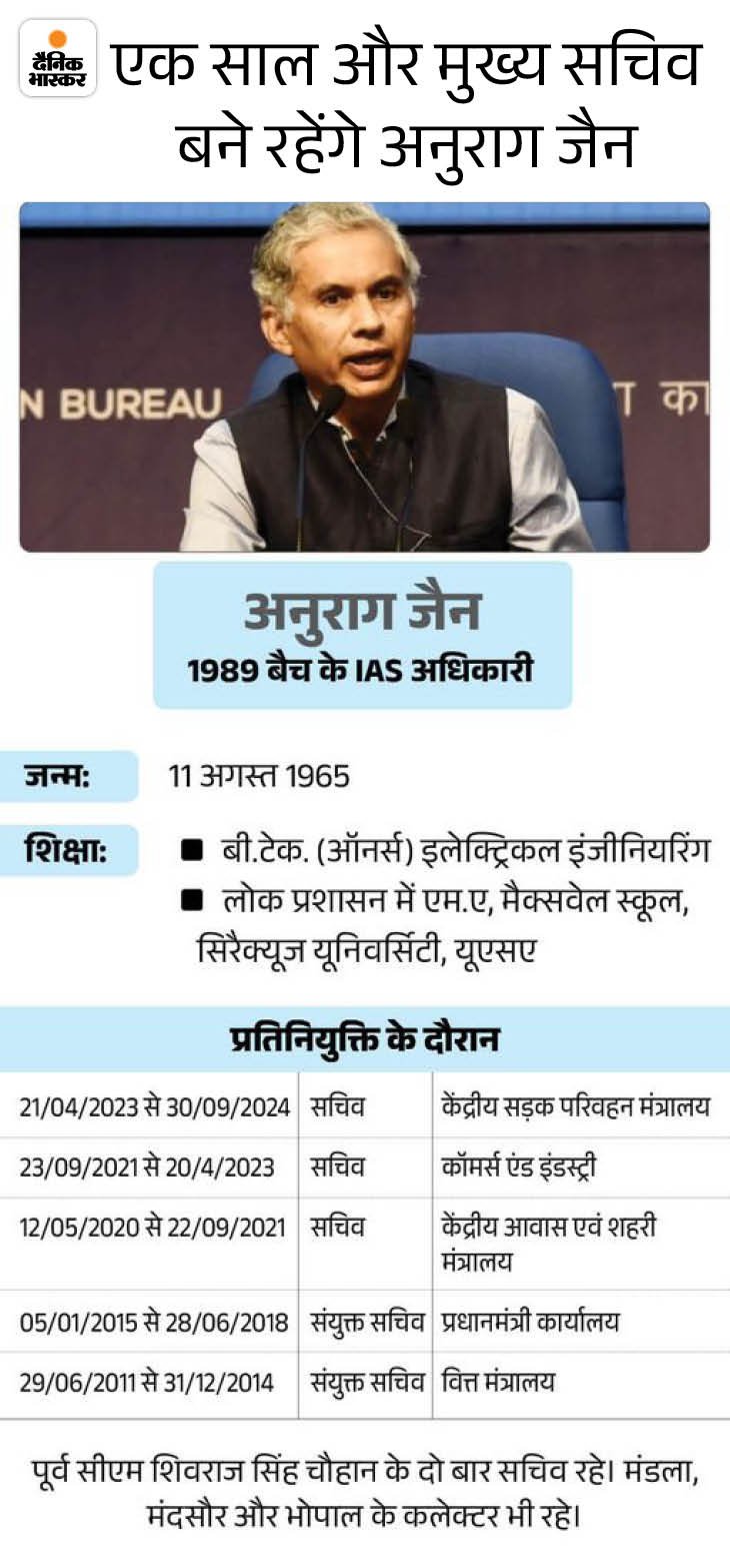 अनुराग जैन मध्यप्रदेश के मुख्य सचिव बने रहेंगे। उन्हें एक साल का एक्सटेंशन मिला है। अनुराग जैन को 31 अगस्त को रिटायर होना था।