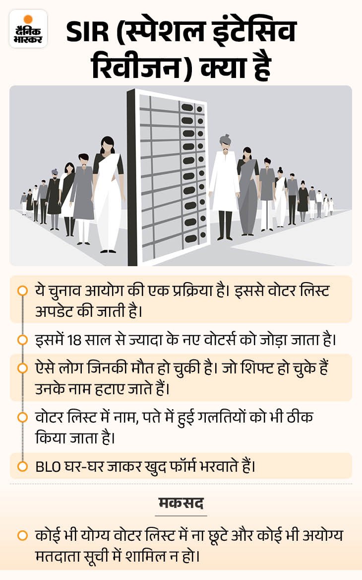 EC के अनुसार, SIR की प्रक्रिया जून 2025 से शुरू की गई थी। इसमें 7.89 करोड़ रजिस्टर्ड वोटर्स से दोबारा फॉर्म भरवाए गए थे। इसके बाद 1 अगस्त को लिस्ट जारी की गई, जिसमें 65 लाख वोटर्स के नाम काट दिए गए थे।