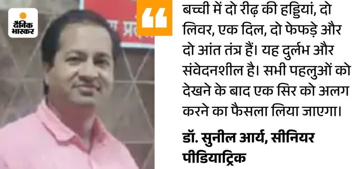 डॉक्टरों की टीम तय करेगी आगे क्या करना है बच्ची के एक सिर को धड़ से अलग करने को लेकर डॉक्टरों की टीम आगे की रणनीति तय करेगी। इस टीम में सर्जन, शिशु रोग विशेषज्ञ और इमेजिंग विशेषज्ञ शामिल होंगे। बच्ची की शारीरिक बनावट और जटिलता के आधार पर सर्जरी विभाग इस बात की जांच करेगा कि सिर अलग करने के बाद भी सभी अंग काम करने में सक्षम होंगे या नहीं।