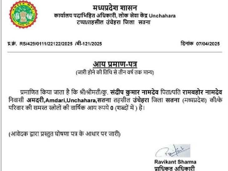 आय प्रमाण पत्र 7 अप्रैल 2025 को जारी किया गया था। सोमवार को ये प्रमाण पत्र सोशल मीडिया पर सामने आया। इस मामले में परियोजना अधिकारी रविकांत शर्मा ने बताया कि त्रुटि मिलने पर 20 जुलाई को आय प्रमाण पत्र निरस्त कर दिया था। इसके बाद संदीप को 40 हजार रुपए सालाना आय वाला प्रमाण पत्र जारी कर दिया था।