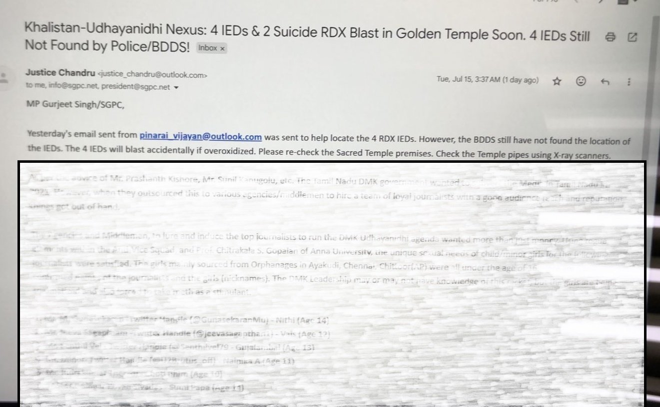 खास बात है कि इस ई-मेल में खालिस्तान के साथ एक उदयनिधि का भी जिक्र है। इस ई-मेल का विषय भी खालिस्तान–उदयानिधि गठजोड़ रखा गया है। ये ई-मेल 15 जुलाई की अलसुबह 3.37 बजे भेजी गई है। जिसमें बीती दो ई-मेल, जो केरल के पूर्व-मुख्यमंत्री पिनारयी विजयन का फेक एड्रेस बना कर भेजी गई, का भी जिक्र है।