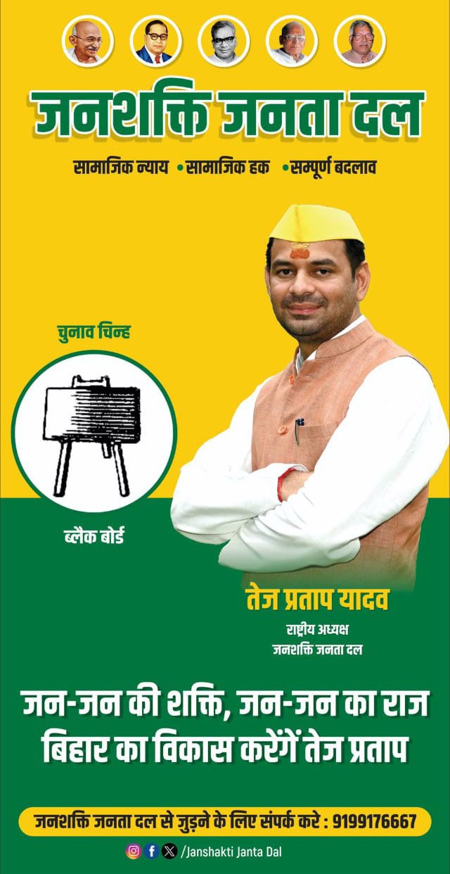 RJD से निकाले गए लालू यादव के बड़े बेटे तेजप्रताप यादव ने अपनी नई पार्टी बना ली है। नाम रखा है ‘जनशक्ति जनता दल’। तेजप्रताप ने अपने X हैंडल पर पार्टी का पोस्टर शेयर किया।