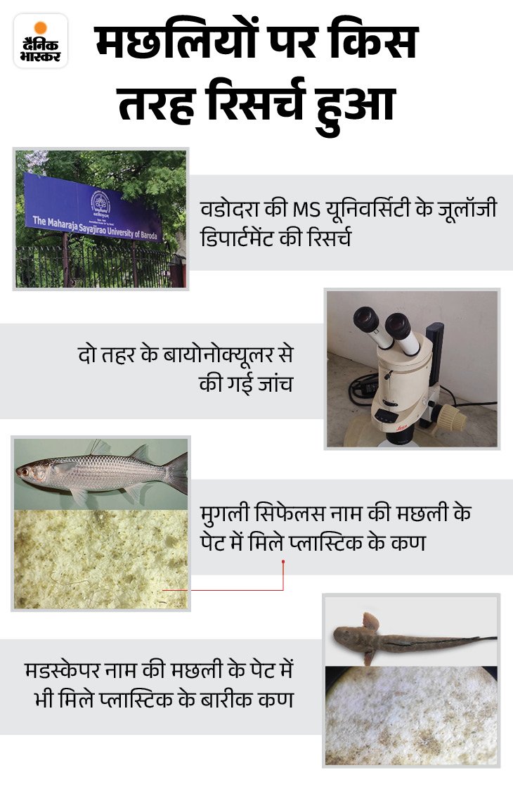 मछुआरों के दो गांवों से ली गईं मछलियां महाराजा सयाजीराव विश्वविद्यालय, वडोदरा के जीव विज्ञान विभाग के स्टूडेंट जलीय जीवों पर लगातार शोध कर रहे हैं। ऐसे ही एक शोध के तहत, प्रियांशु और रश्मि रेस्माकर नाम दो स्टूडेंट्स भड़भूत और हंसोत पहुंचे। दोनों ने ज्यादा बिकने वाली दो प्रजातियों की मछलियां मुगली सेफेलस और मडस्किपर खरीदीं और फिर टीम ने इन पर रिसर्च किया। जांच में पता चला कि दोनों ही मछलियों के पेट में प्लास्टिक और नायलोन की रस्सी के के कई बारीक कण भी थे।