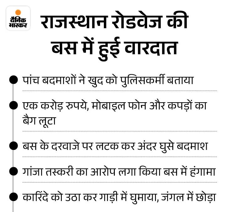 रामप्रमेश्वर शर्मा ने पुलिस को बताया कि पैसे लेने के बाद वह कैलाश अग्रवाल की स्कूटी पर बैठकर वृंदावन के छटिकरा मोड़ पर पहुंचे, जहां से उन्होंने राजस्थान रोडवेज की बस पकड़ी। रात के समय जब बस बघौला फ्लाईओवर के नीचे सर्विस रोड पर चल रही थी, तब एक युवक बस के दरवाजे पर लटक गया। एक यात्री ने दरवाजा खोल दिया। कुछ देर बाद मीरापुर गांव के मोड़ पर एक और युवक ने बस रुकवाई।