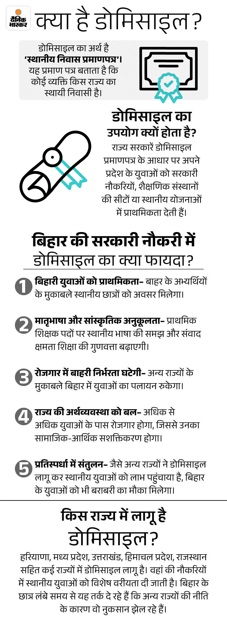‘शिक्षा व्यवस्था के सुदृढ़ीकरण हेतु बड़ी संख्या में शिक्षकों की नियुक्ति की गई है। शिक्षकों की बहाली में बिहार के निवासियों (DOMICILE) को प्राथमिकता देने हेतु शिक्षा विभाग को संबंधित नियम में आवश्यक संशोधन करने का निर्देश दिया गया है।’