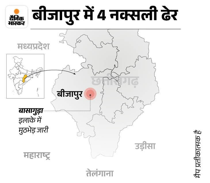 छत्तीसगढ़ के बीजापुर जिले में शनिवार शाम को मुठभेड़ में जवानों ने 4 नक्सलियों को मार गिराया है। सभी के शव और INSAS-SLR राइफल समेत बड़ी संख्या में हथियार, विस्फोटक बरामद किए गए हैं। मारे गए नक्सलियों का आंकड़ा बढ़ सकता है। मामला बासागुड़ा थाना इलाके क