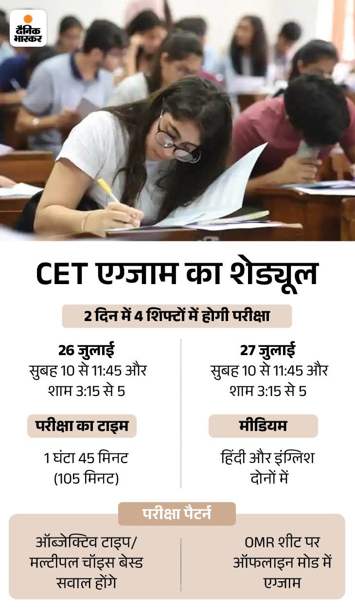 5. क्या CET पास होते ही नौकरी मिल जाती है, या फिर कोई और एग्जाम भी देना होता है? ग्रुप-C व D की भर्ती के लिए CET पास होना जरूरी है। ये एक तरह से प्री एग्जाम है। उसके बाद कुछ पदों पर भर्ती के लिए संबंधित विभाग का एग्जाम भी देना हो सकता है। जैसे पटवारी के लिए। आसान शब्दों में समझें कि ग्रुप सी या डी में निकली पोस्टों के लिए आवेदन के लिए प्री एग्जाम में पास होना जरूरी होता है। इसके बाद जब डिपार्टमेंट वाइज पोस्टें निकाली जाती हैं तो फिर मेंस का एग्जाम देना होता है। हालांकि ये दोनों एग्जाम ऑब्जेक्टिव ही होते हैं।