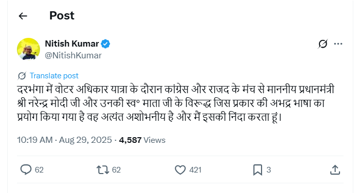 मामले को लेकर मुख्यमंत्री नीतीश कुमार ने भी आपत्ति जताई है। नीतीश कुमार ने सोशल मीडिया में पोस्ट कर इसकी निंदा की।
