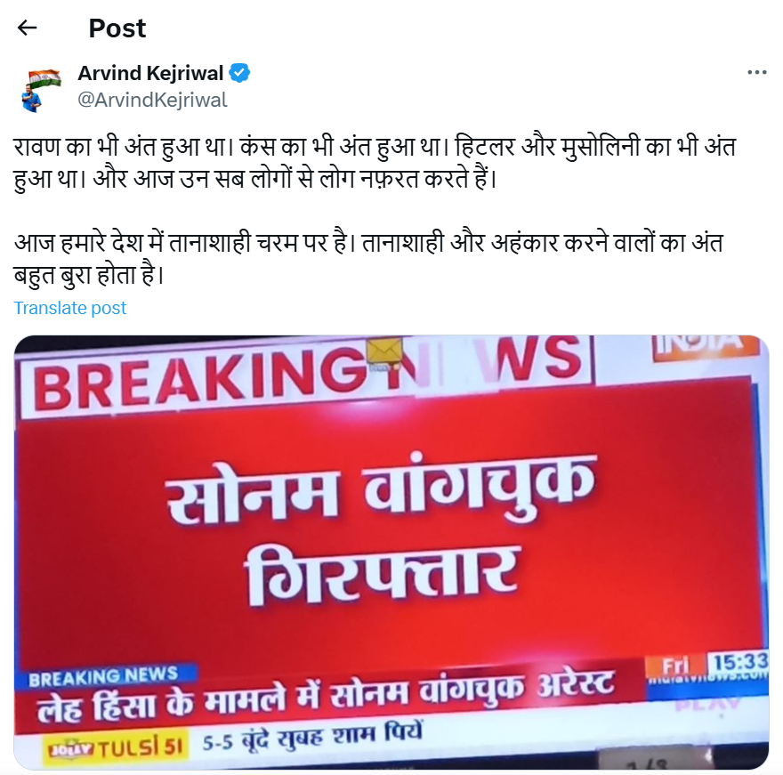 उन्होंने कहा कि सोनम वांगचुक गांधीवादी तरीके से लद्दाख-कारगिल को पूर्ण राज्य का दर्जा दिलाने के साथ ही वहां के लोगों के लिए शिक्षा, स्वस्थ्य और रोजगार की मांग कर रहे थे। मोदी सरकार मानसिक दिवालियेपन का शिकार हो गई है। सोनम वांगचुक की गिरफ्तारी मोदी जी की बड़ी गलती है। लद्दाख की जनता को आंदोलन करने से रोकना बड़े जन विद्रोह का कारण बनेगा।