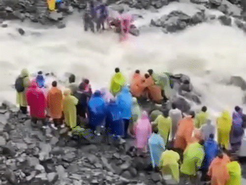 मणिमहेश यात्रा पर गए श्रद्धालु जान जोखिम में डालकर उफनते नाले को पार करते हुए।