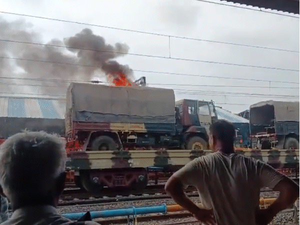 सेना के ट्रक में आग, हाइटेंशन लाइन से जला: उज्जैन में मालगाड़ी में लोड था ट्रक; जोधपुर जा रहा था सामान – Ujjain News Sep 21, 2025 By Inder India News
